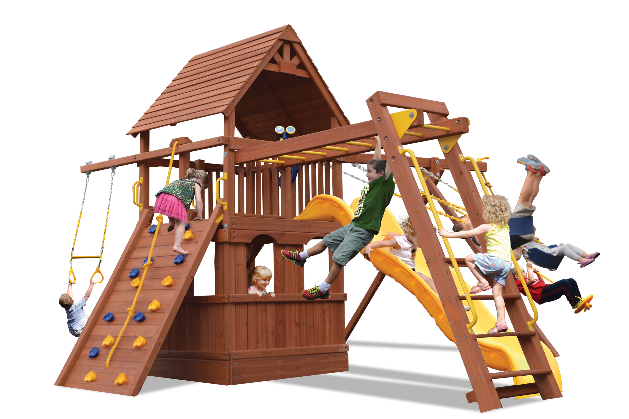 Includes: Wood roof, 10' wave slide, lower level enclosure playhouse, monkey bars, grip-n-go bar, rockwall with climbing rope, step ladder with handrails, 3 position swing beam with 2 belt swings and knotted rope with disc, accessory arm with trapeze bar, ships wheel and safety handles.
