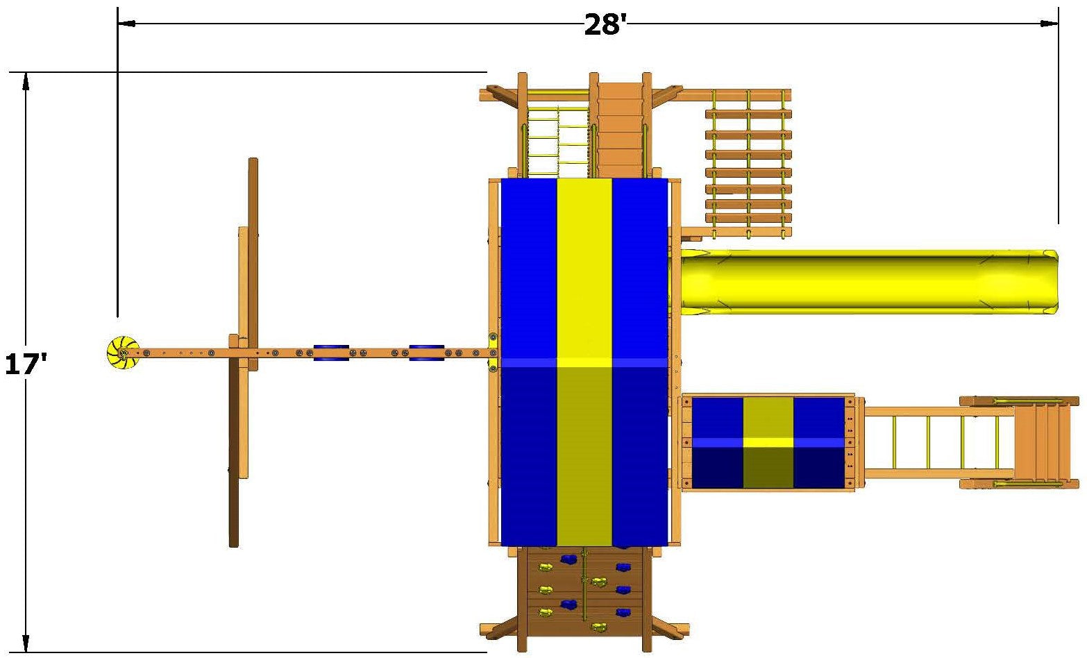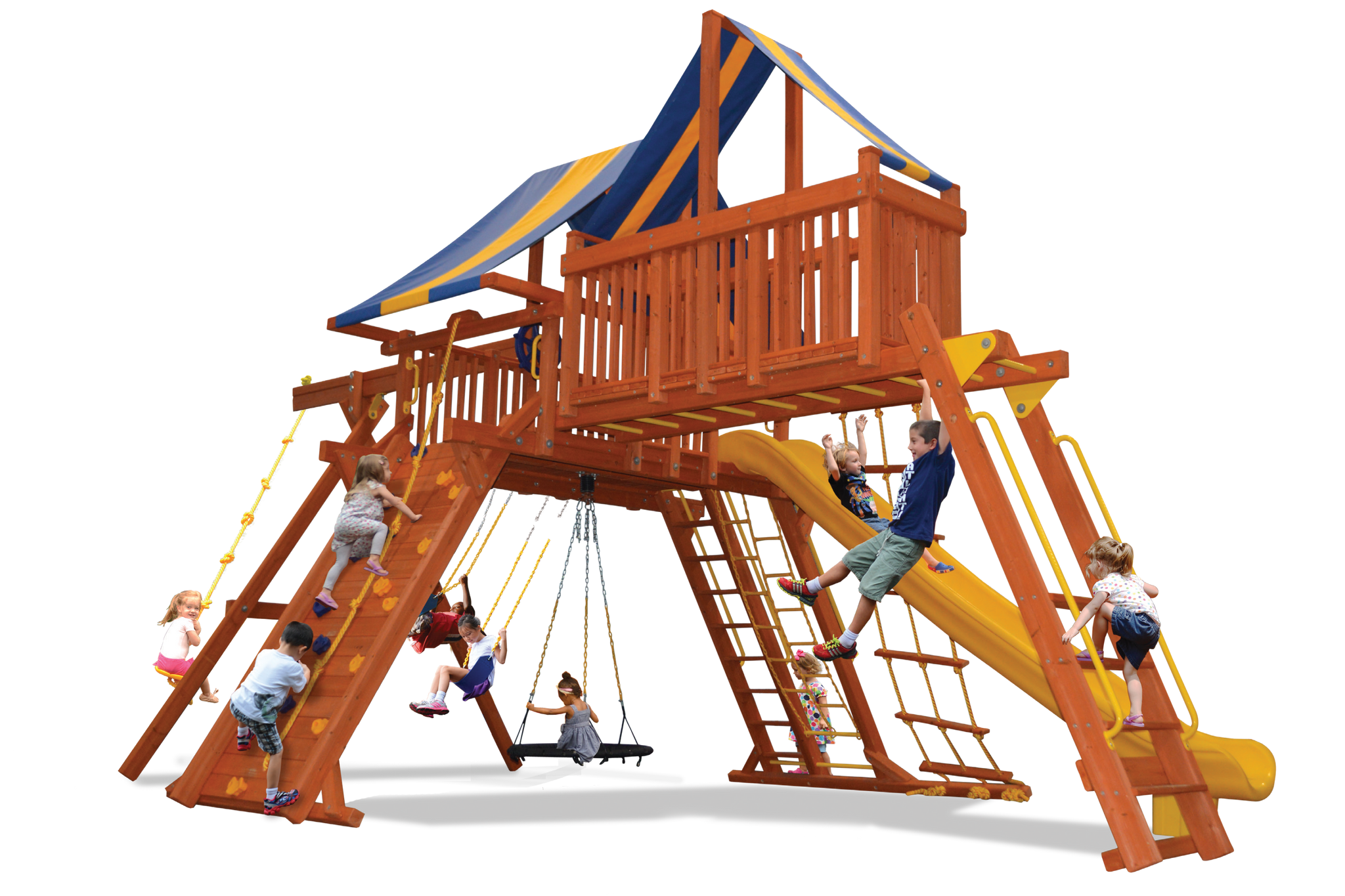 Includes: Heavy duty canopy roof, monkey bars, sky loft, 15’ Super Ride Slide, rockwall with climbing rope, rope ladder, step/chain ladder with handrails, swing beam with 2 belt swings and knotted rope with disc, grip-n-go bar, accessory arm with trapeze bar, 360° tire swing, ships wheel and safety handles.