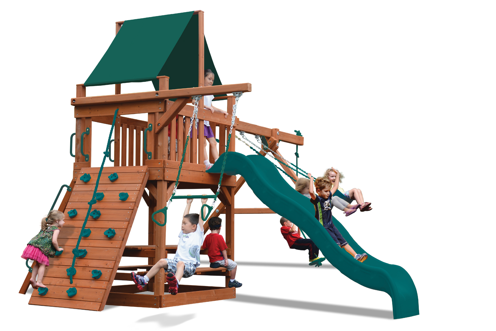 Includes: Heavy duty canopy roof, 10' wave slide, rockwall with climbing rope, step ladder with handrails, 3 position swing beam with 2 belt swings and trapeze bar, accessory arm with trapeze bar, 3 in 1 picnic table, ships wheel and safety handles.