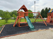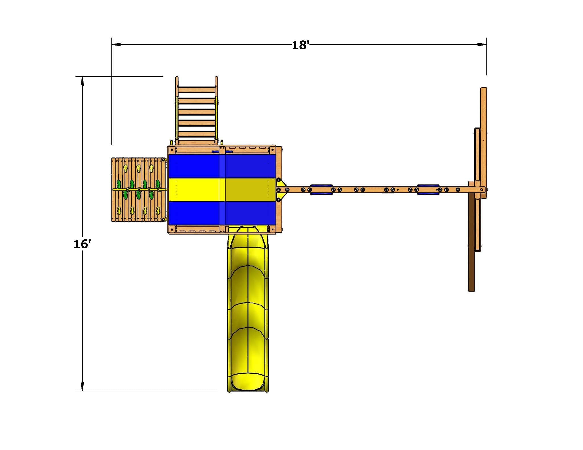 Includes: Wood roof, 10' wave slide, rockwall with climbing rope, step ladder with handrails, 3 position swing beam with 2 belt swings and trapeze bar, 3 in 1 picnic table, ships wheel and safety handles.