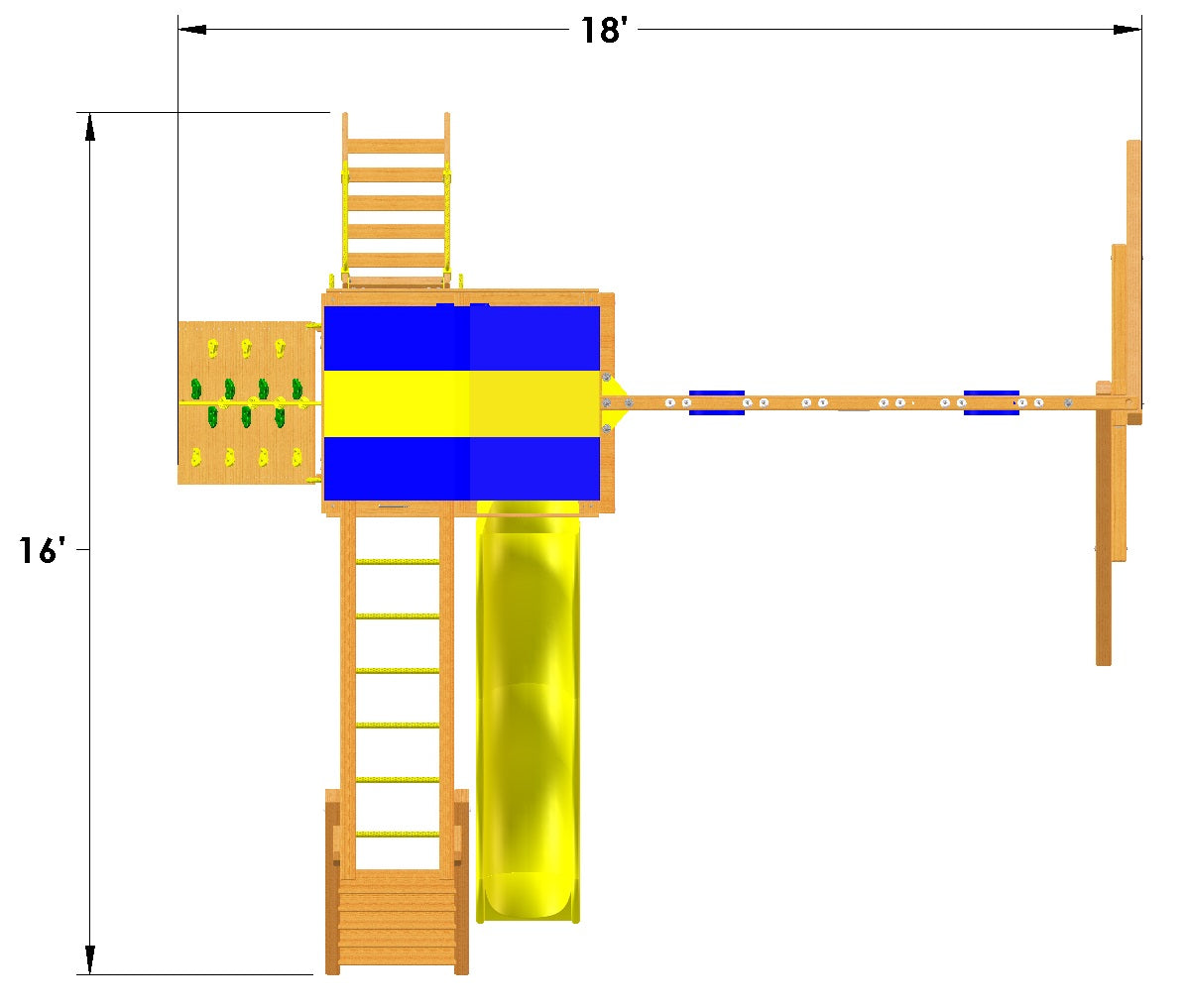Includes: Heavy duty canopy roof, monkey bars, 10' wave slide, rockwall with climbing rope, step ladder with handrails, 3 position swing beam with 2 belt swings and trapeze bar, 3 in 1 picnic table, ships wheel and safety handles.
