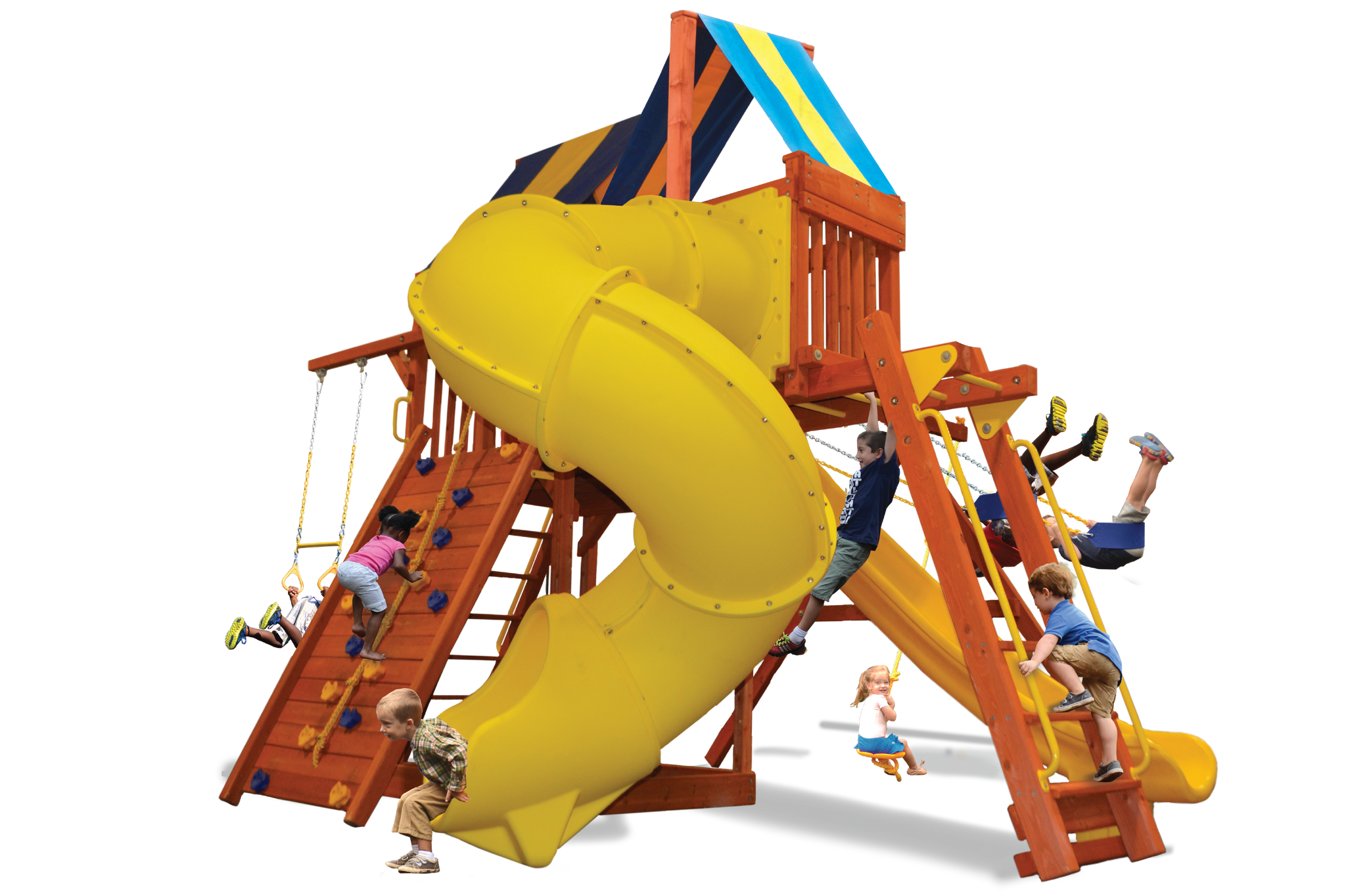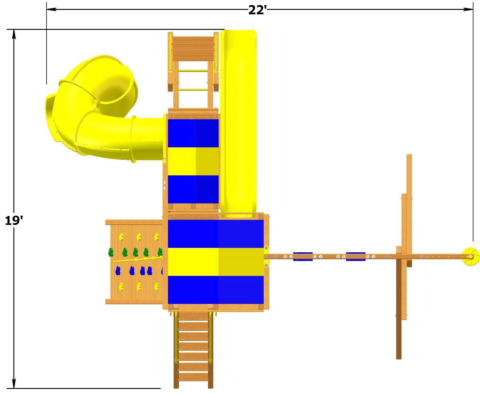Includes: Heavy duty canopy roof, 13' Super Ride Slide, rockwall with climbing rope, step ladder with handrails, 3 position swing beam with 2 belt swings and knotted rope with disc, grip-n-go bar, monkey bars, sky loft, corkscrew slide, accessory arm with trapeze bar, ships wheel and safety handles.