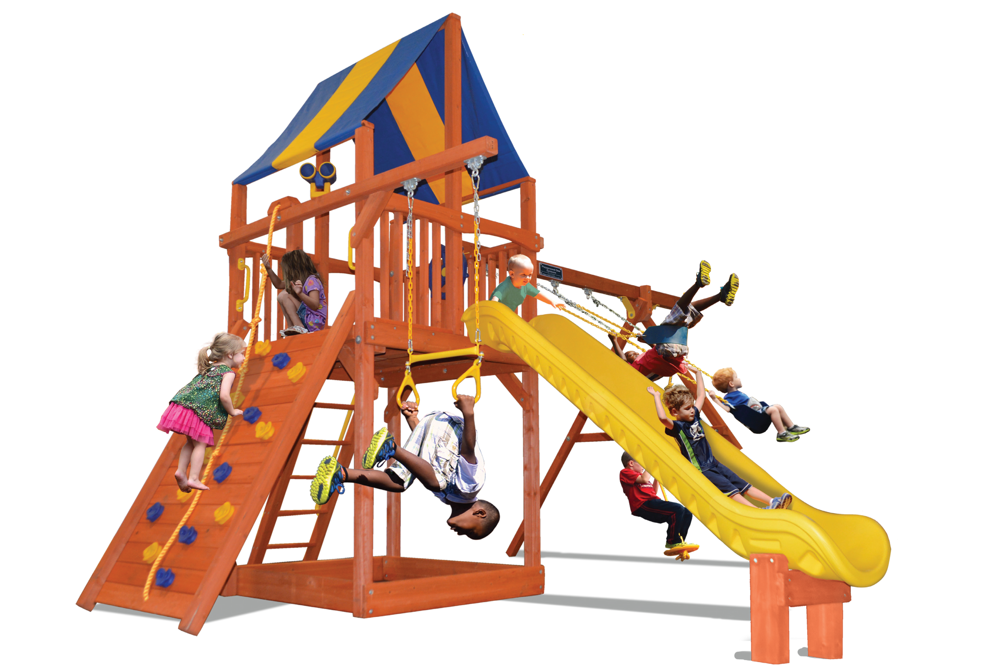 Includes: Heavy-duty canopy roof, 11' Turbo Slide, rockwall with climbing rope, step ladder with handrails, 3 position swing beam with 2 belt swings and knotted rope with disc, grip-n-go bar, accessory arm with trapeze bar, ships wheel and safety handles.