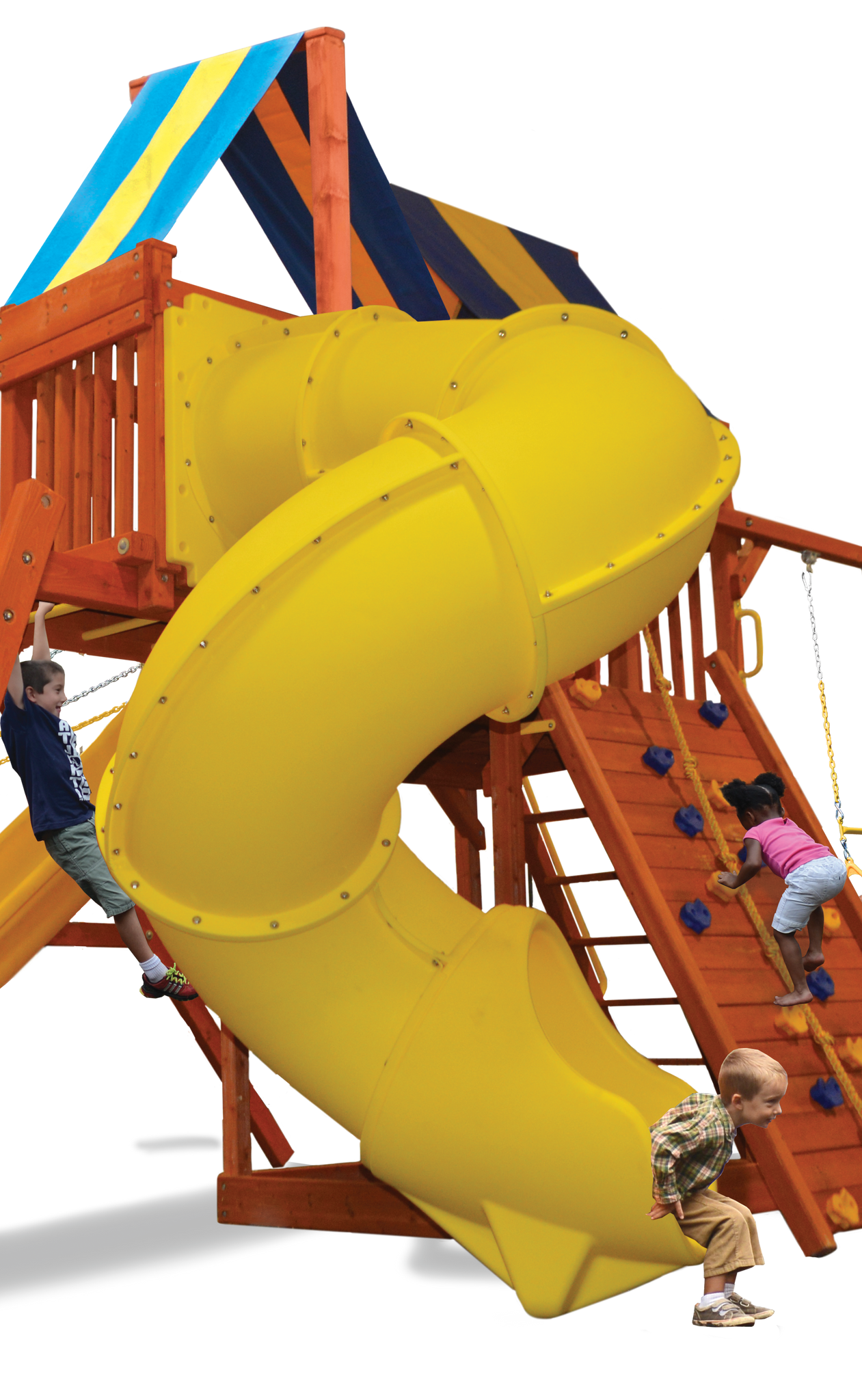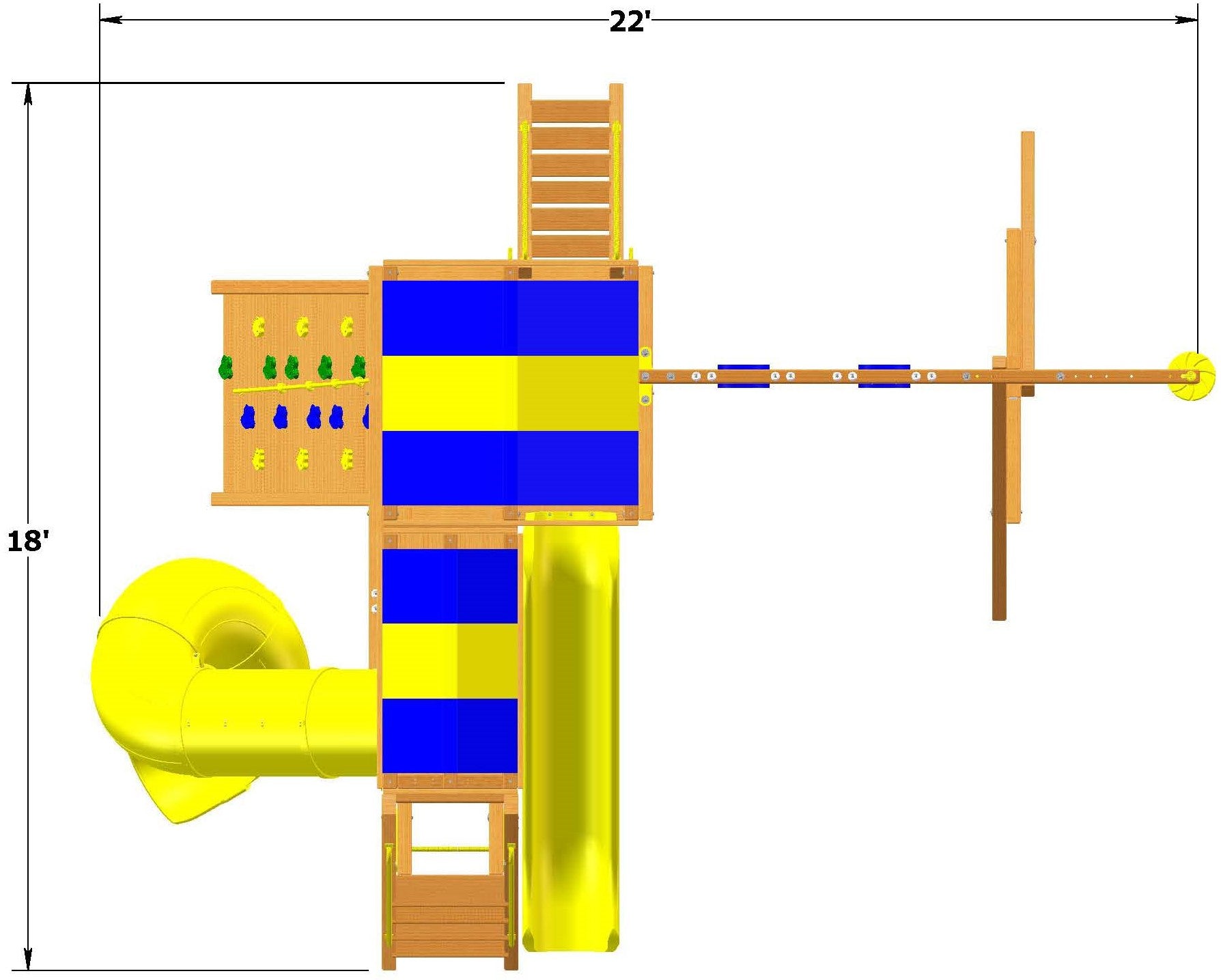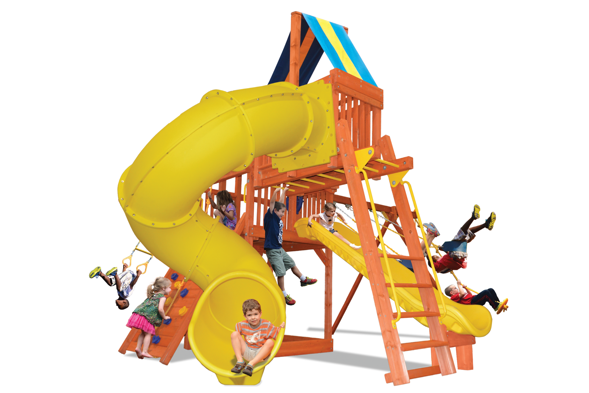 Includes: Heavy-duty canopy roof, 11' turbo slide, grip-n-go bar, rockwall with climbing rope, step ladder with handrails, 3 position swing beam with 2 belt swings and knotted rope with disc, monkey bars, sky loft, corkscrew slide, accessory arm with trapeze bar, ships wheel and safety handles.