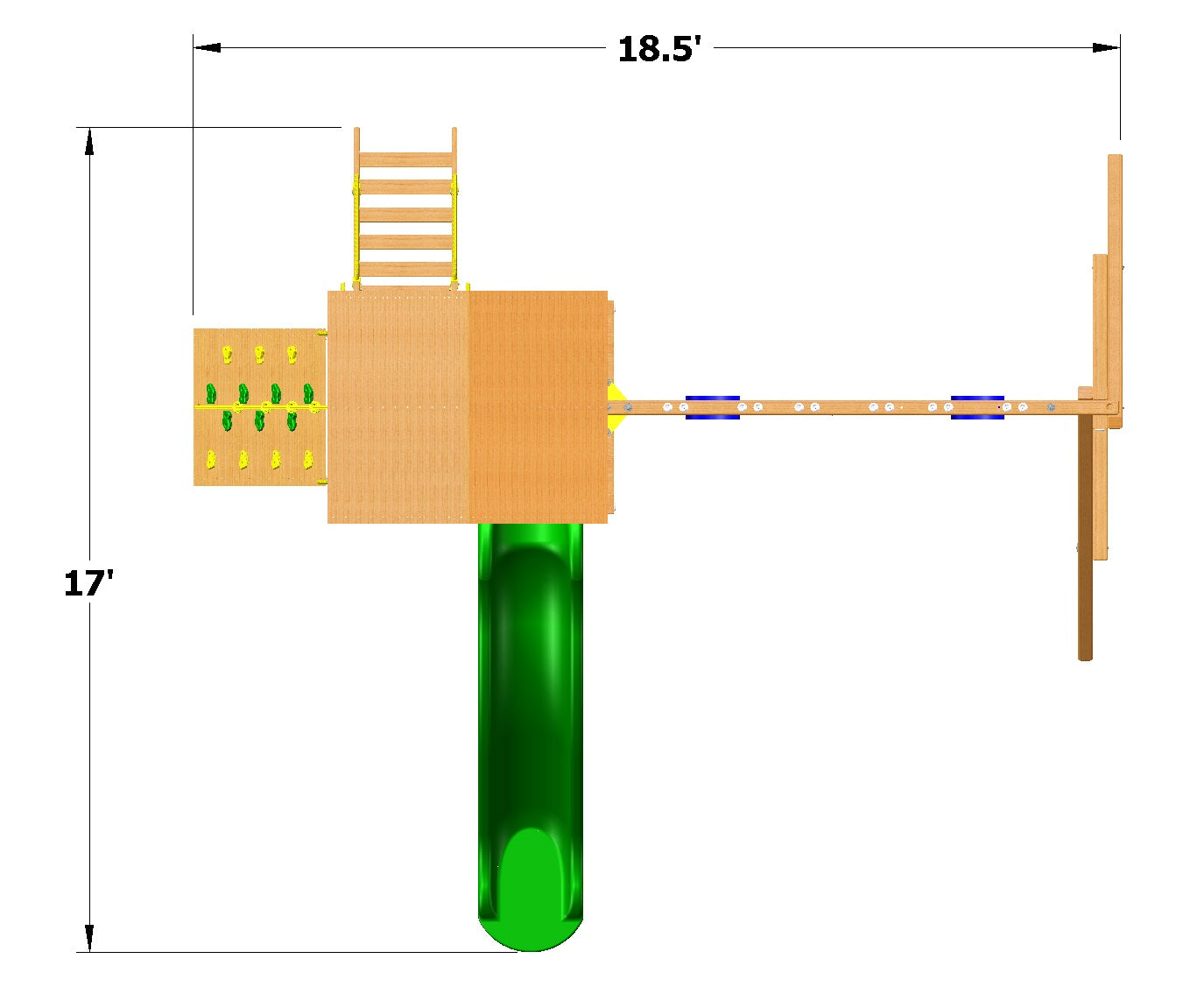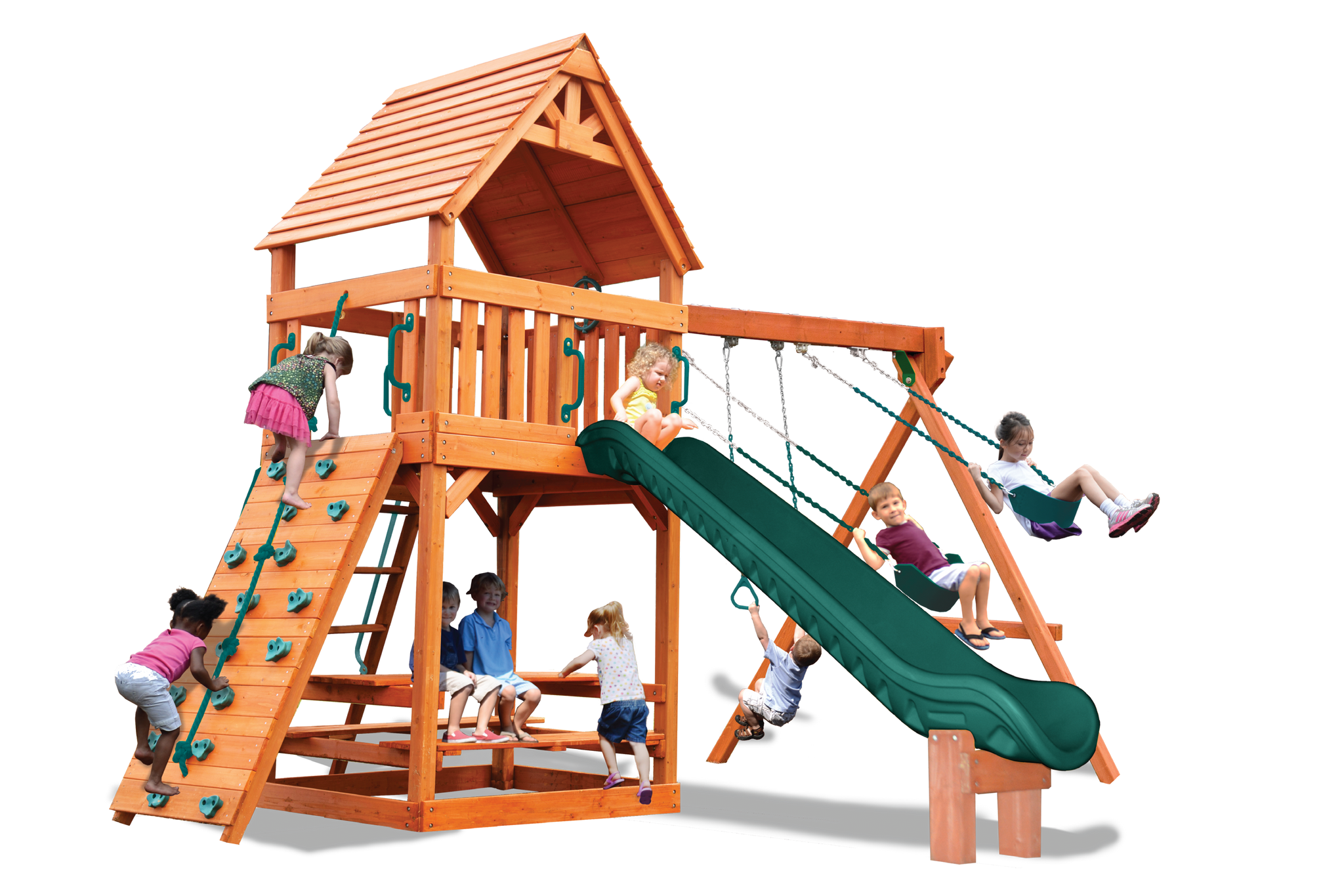 Includes: Wood roof, 11' turbo slide, rockwall with climbing rope, step ladder with handrails, 3 position swing beam with 2 belt swings and trapeze bar, 3 in 1 picnic table, ships wheel and safety handles.