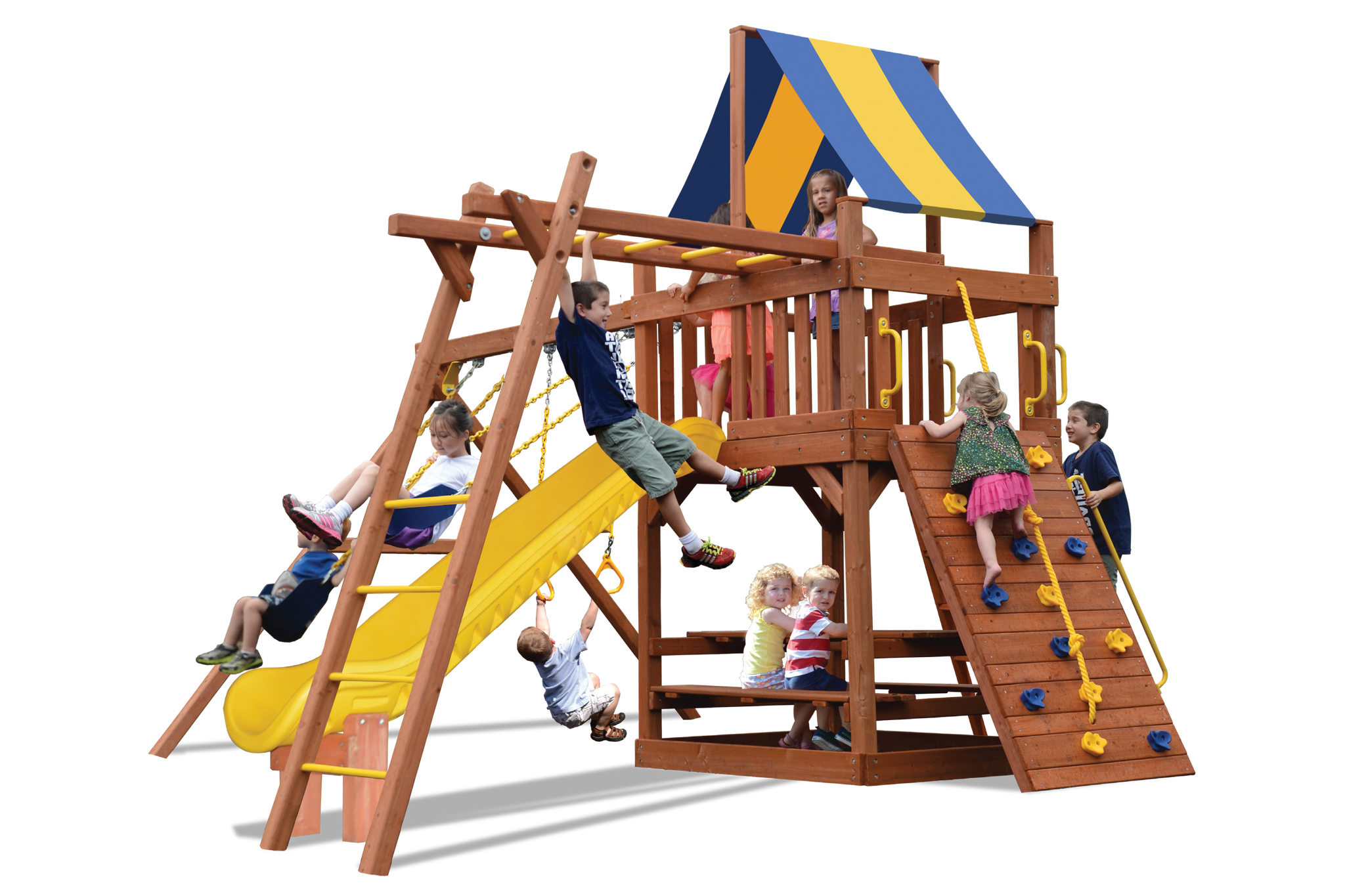 Includes: Heavy duty canopy roof, monkey bars, 11' turbo slide, rockwall with climbing rope, step ladder with handrails, 3 position swing beam with 2 belt swings and trapeze bar, 3 in 1 picnic table, ships wheel and safety handles.
