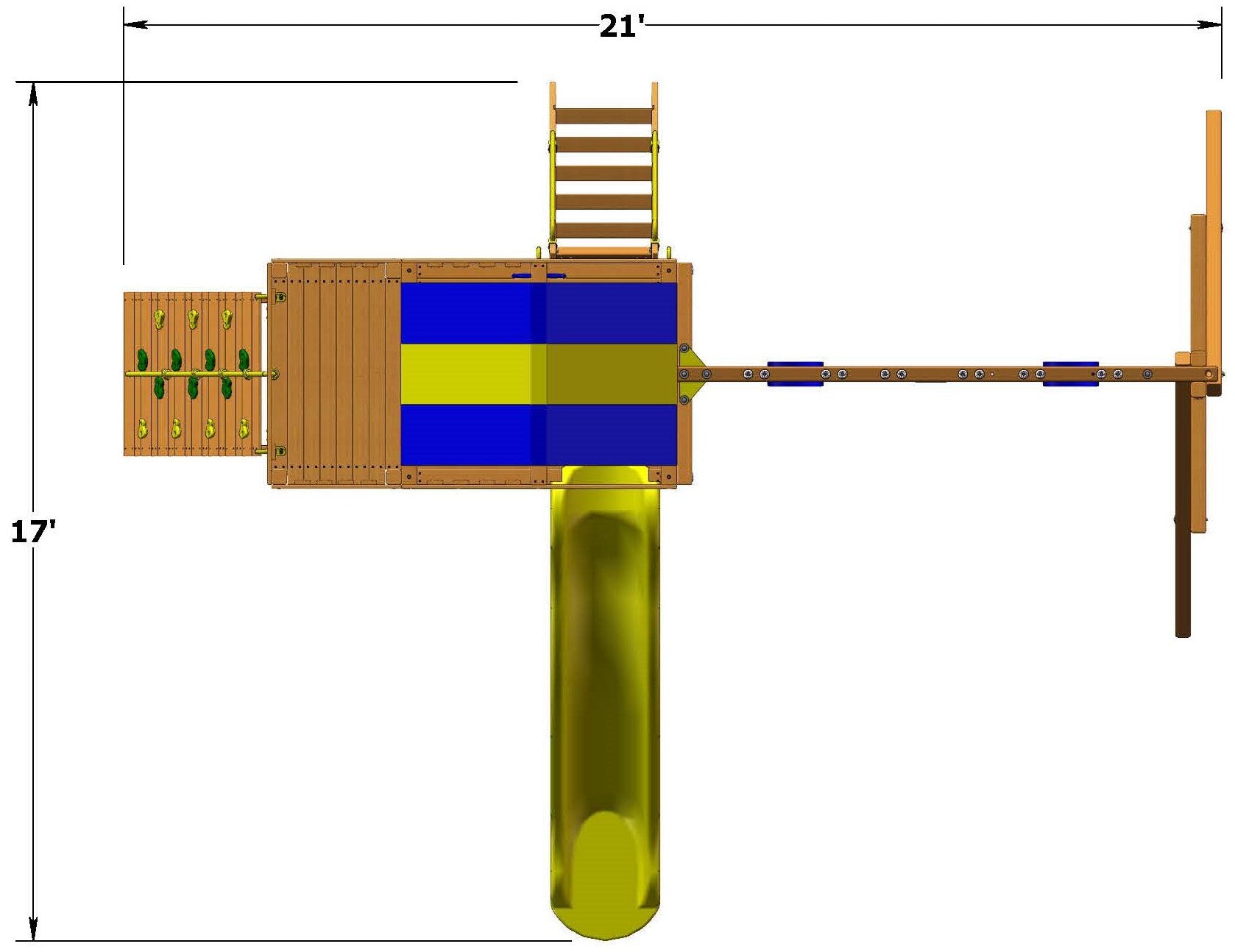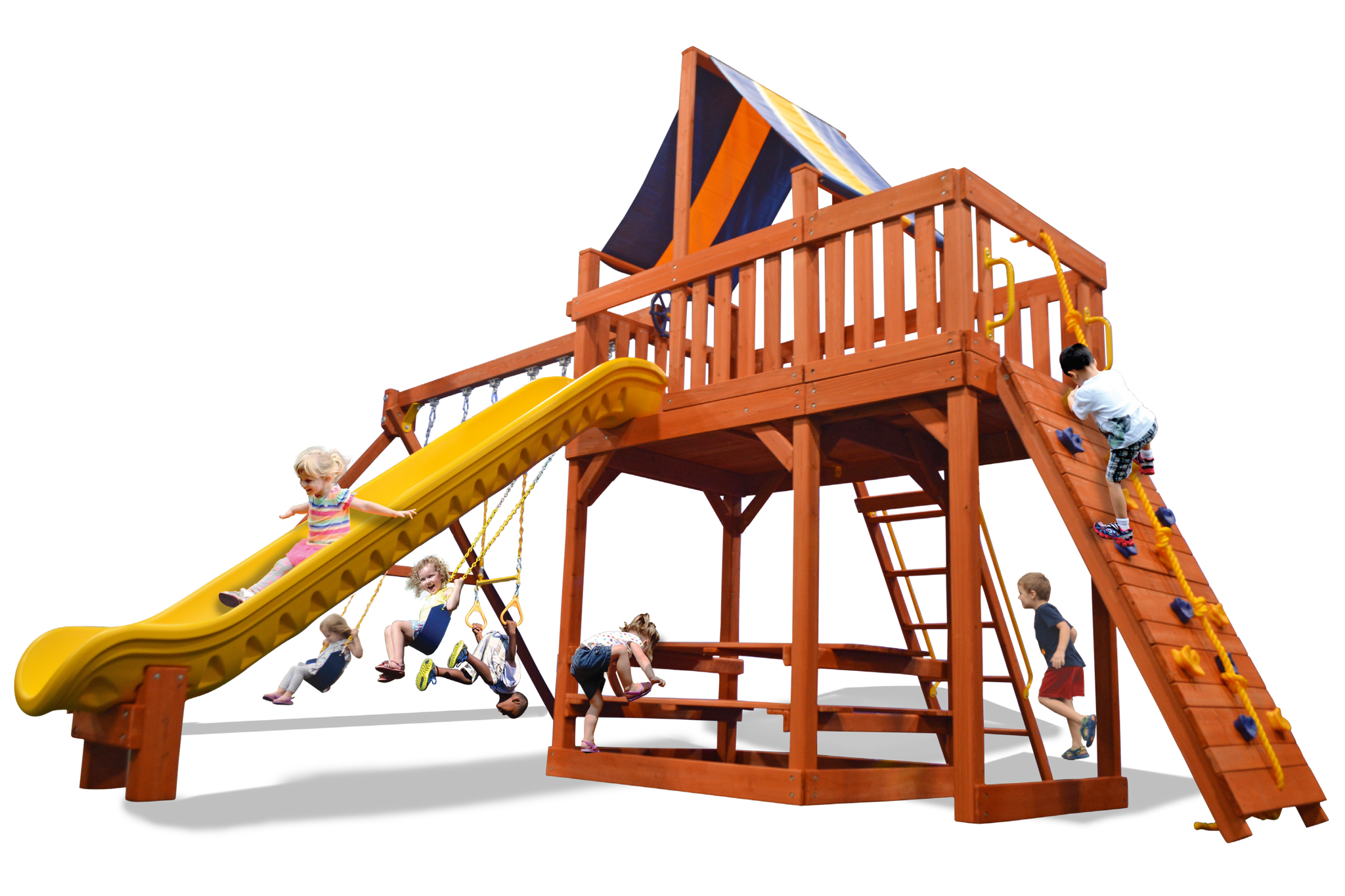 Includes: 50% bigger play deck, heavy duty canopy roof, 11' turbo slide, rockwall with climbing rope, step ladder with handrails, 3 position swing beam with 2 belt swings and trapeze bar, 3 in 1 picnic table, ships wheel and safety handles.