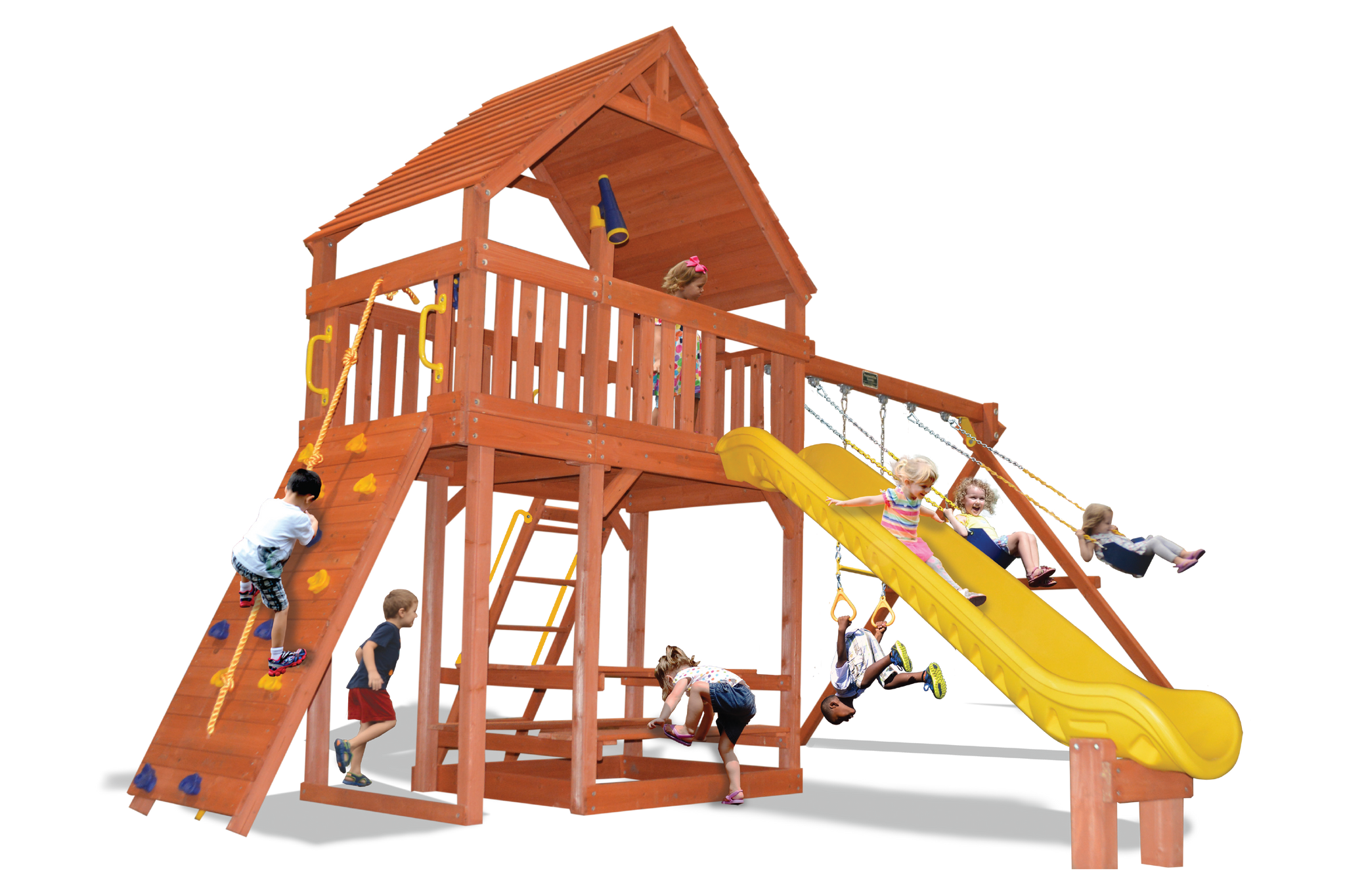 Includes: 50% bigger play deck, wood roof, 11' turbo slide, rockwall with climbing rope, step ladder with handrails, 3 position swing beam with 2 belt swings and trapeze bar, 3 in 1 picnic table, ships wheel and safety handles.
