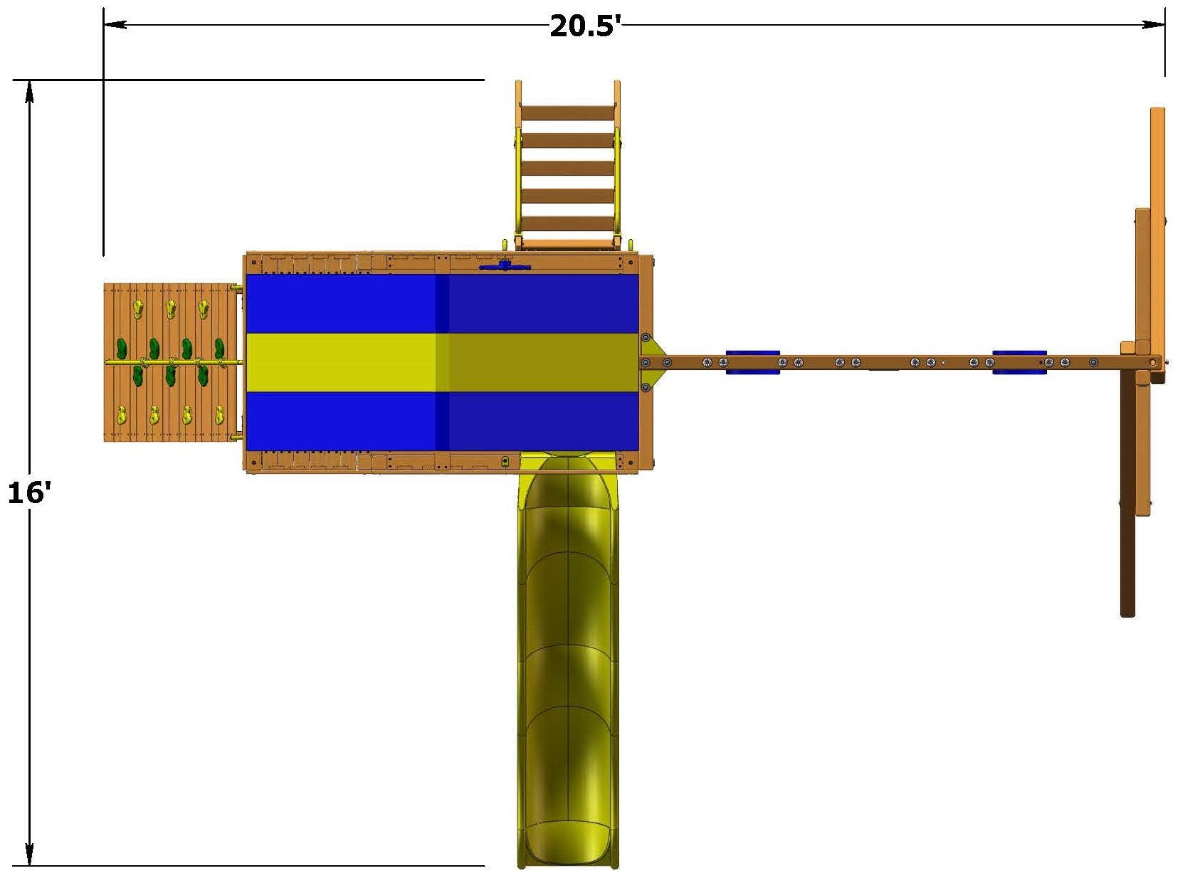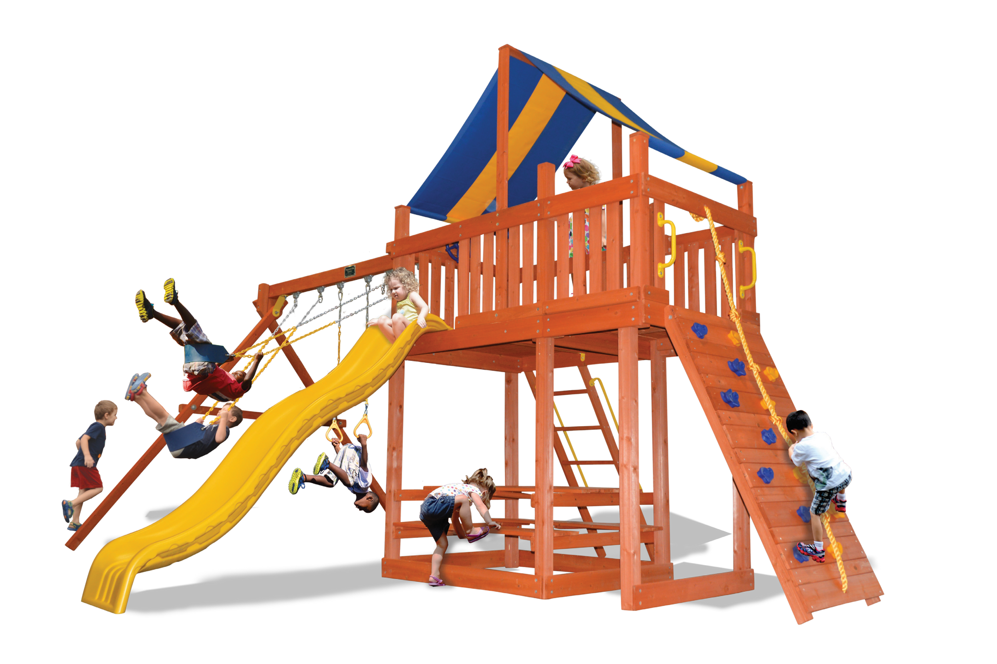 Includes: 50% bigger play deck, heavy duty canopy roof, 10' turbo slide, rockwall with climbing rope, step ladder with handrails, 3 position swing beam with 2 belt swings and trapeze bar, 3 in 1 picnic table, ships wheel and safety handles.