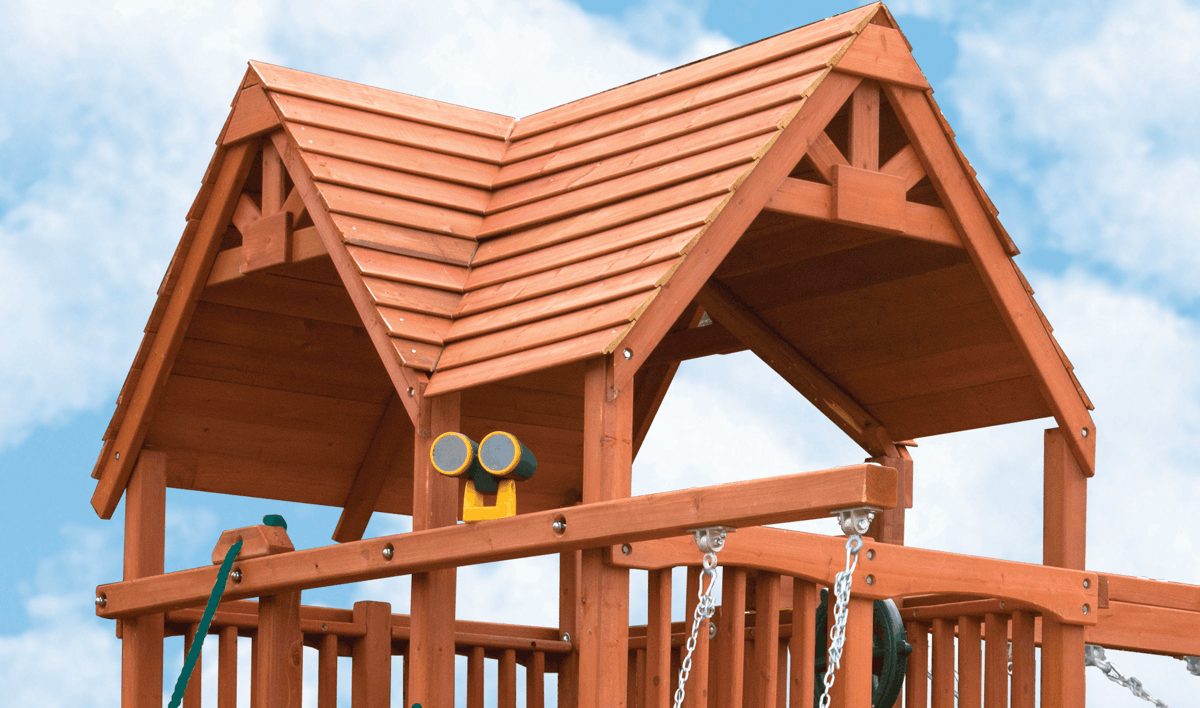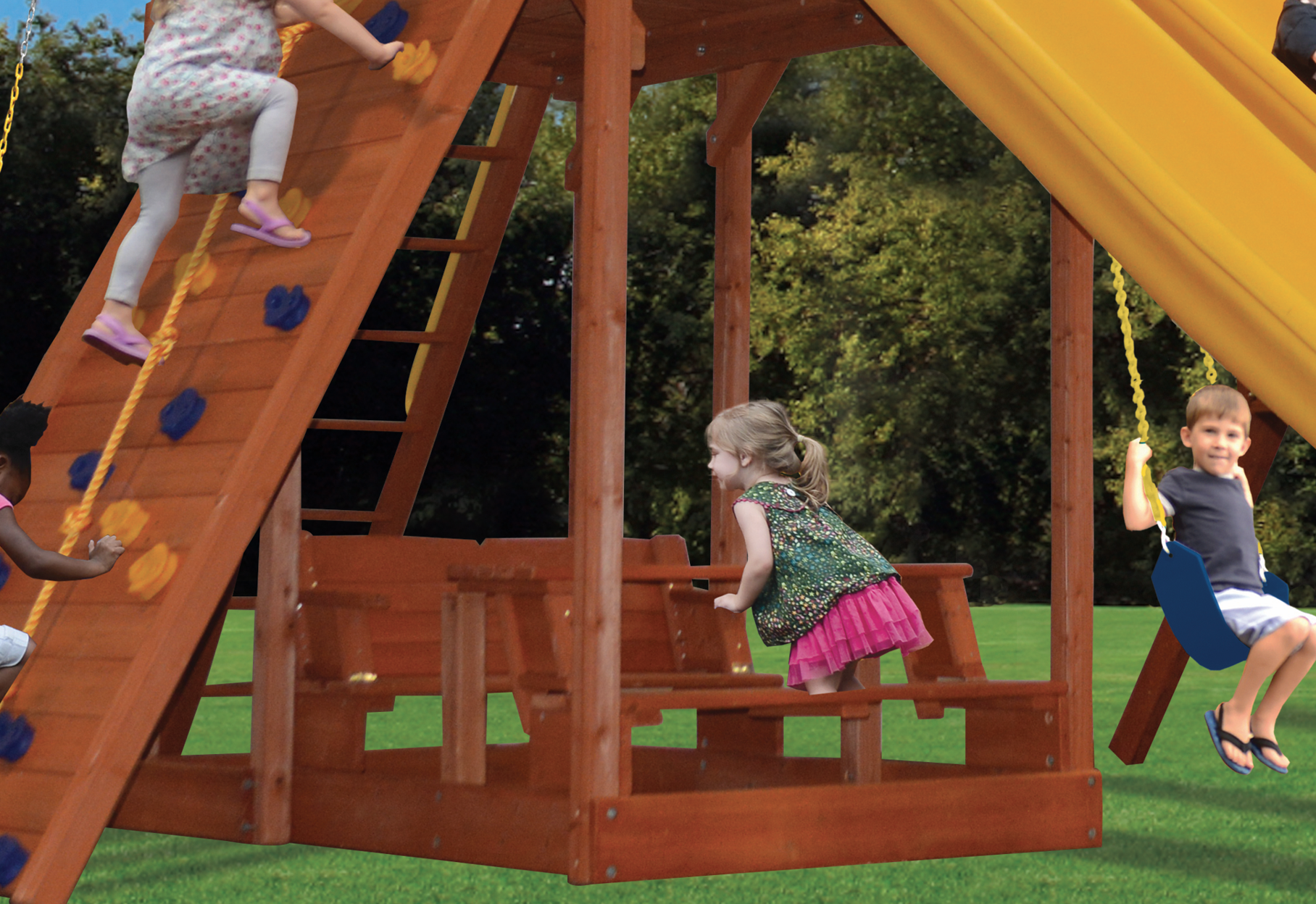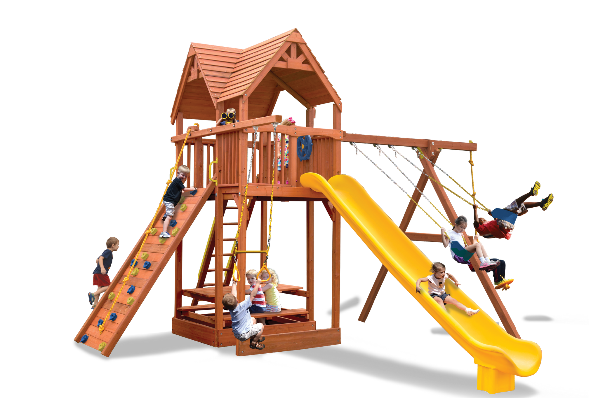 Includes: Wood Roof, Premier Picnic Table, 13' Super Ride Slide, rockwall with climbing rope, step ladder with handrails, 3 position swing beam with 2 belt swings and knotted rope with disc, grip-n-go bar, accessory arm with trapeze bar, ships wheel and safety handles.